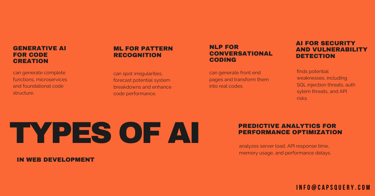 AI in web development exists as multiple distinct technologies, each operating at specific points throughout the development process. Below are the key categories of AI-driven web development workflows in 2025: